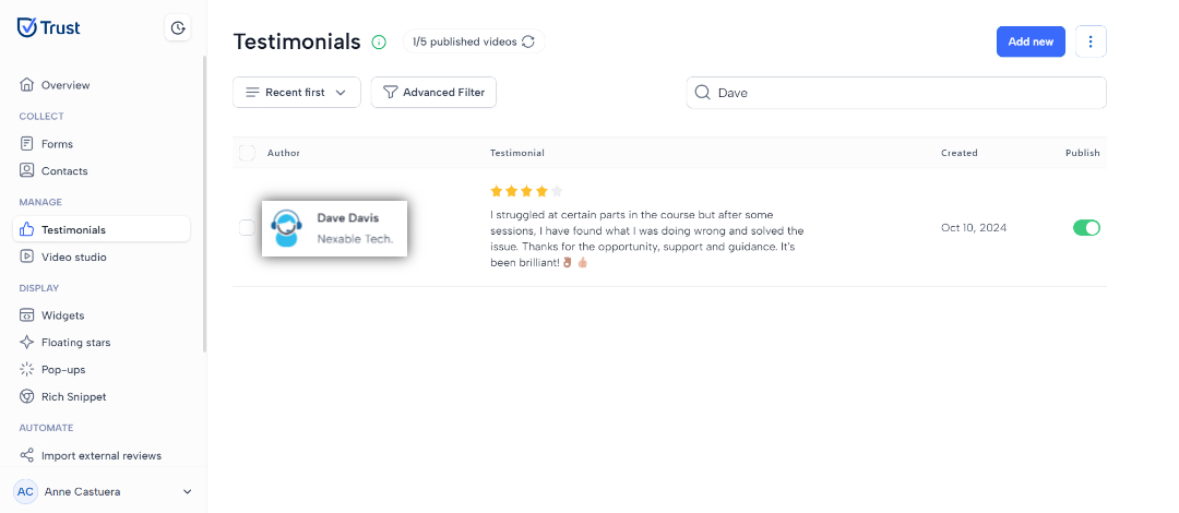 4. Another way to filter your testimonials is by using the Advanced Filter. This can be used by clicking on the “Advanced Filter” button.